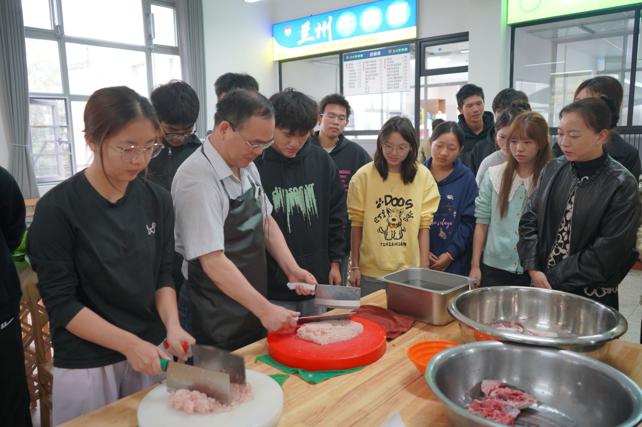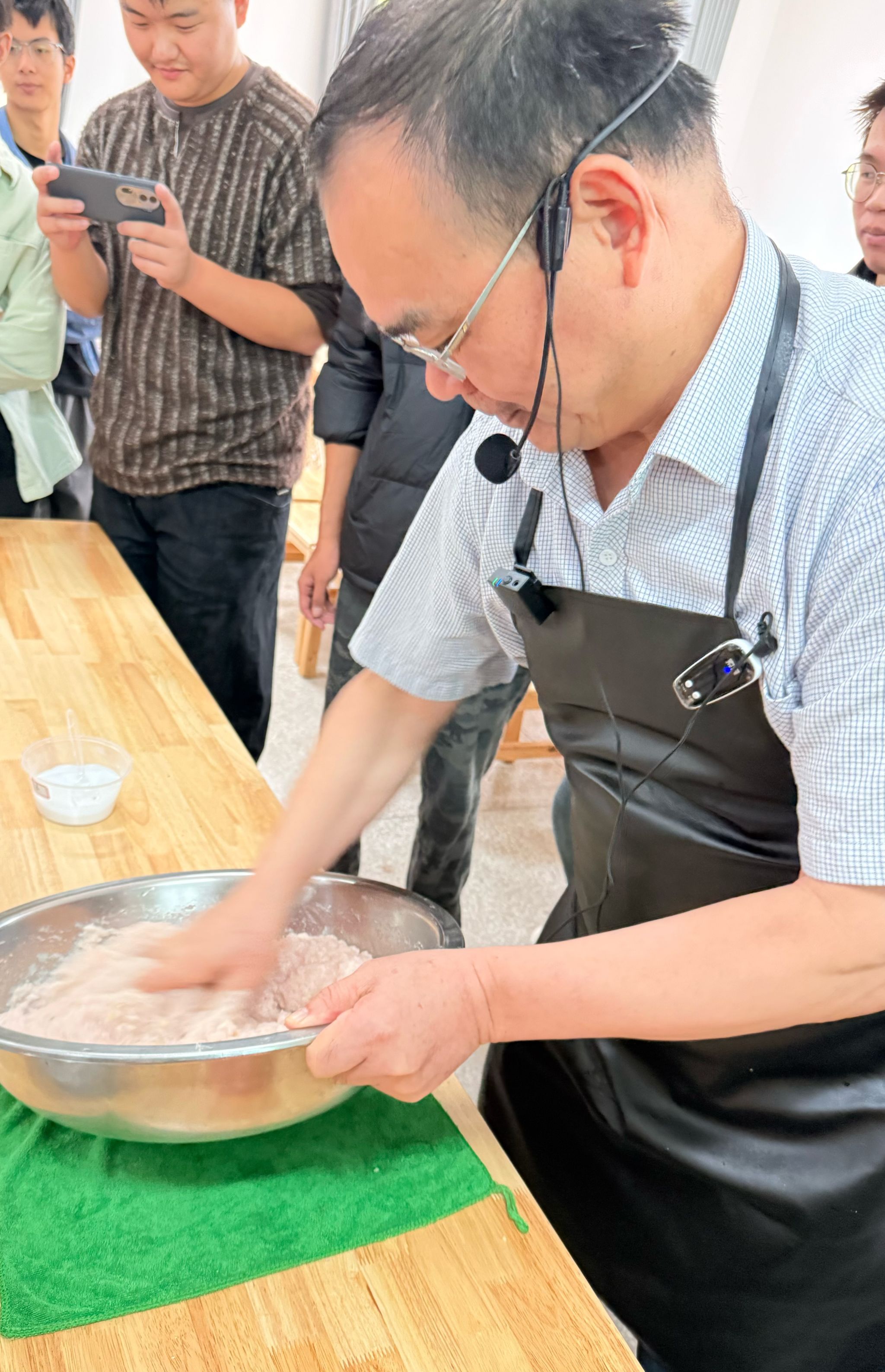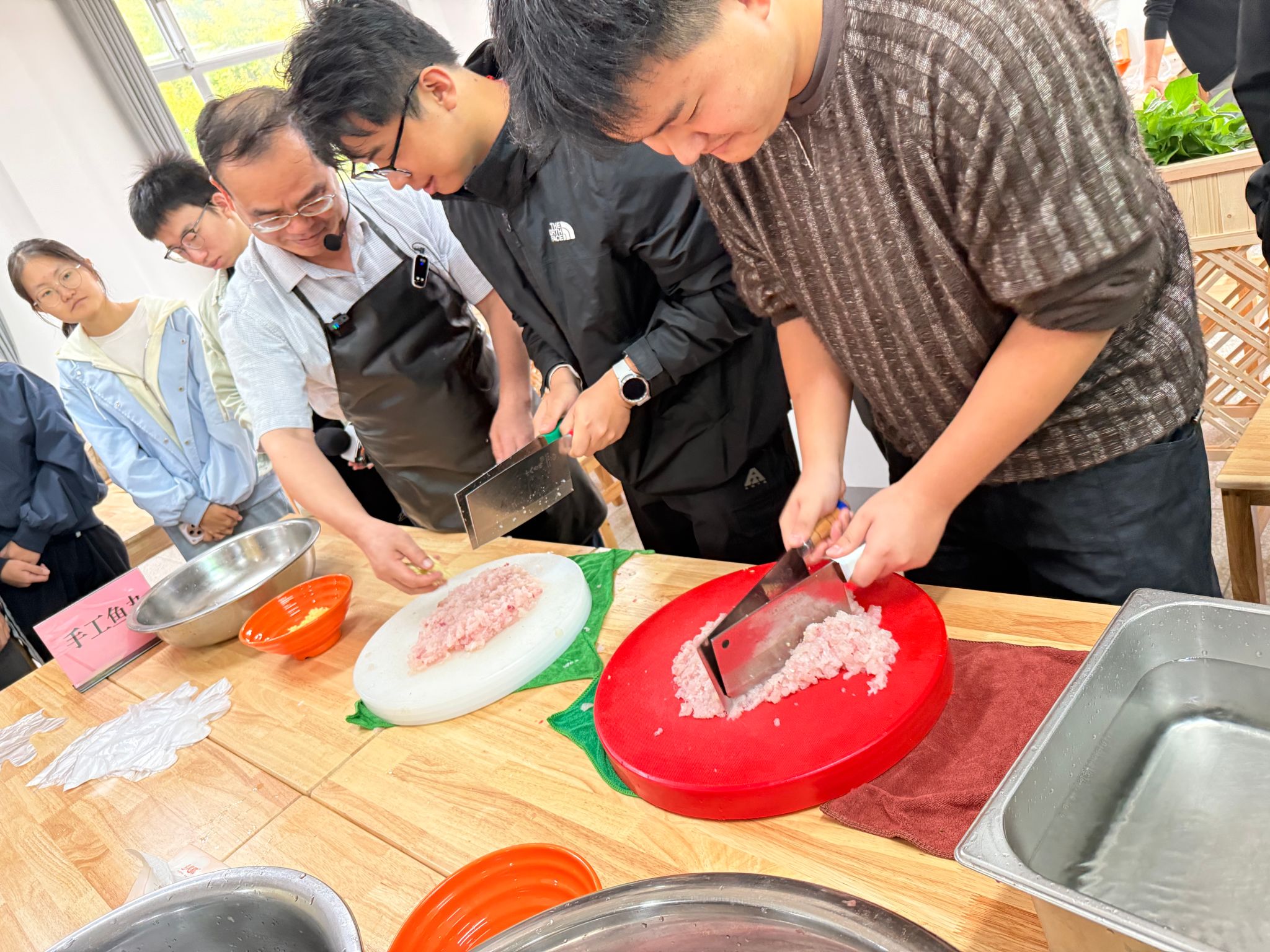 家宴现场,向家文书记身着围裙,亲手教授同学们制作湖北特色菜肴——手工鱼丸。只见他一边处理鱼肉,一边仔细给同学们讲解这道菜的注意事项和技巧。现场同学们被他精湛的刀工、耐心的教导深深吸引,鱼丸也在“千锤百炼”逐渐成型,成为餐桌上最受欢迎的菜品。