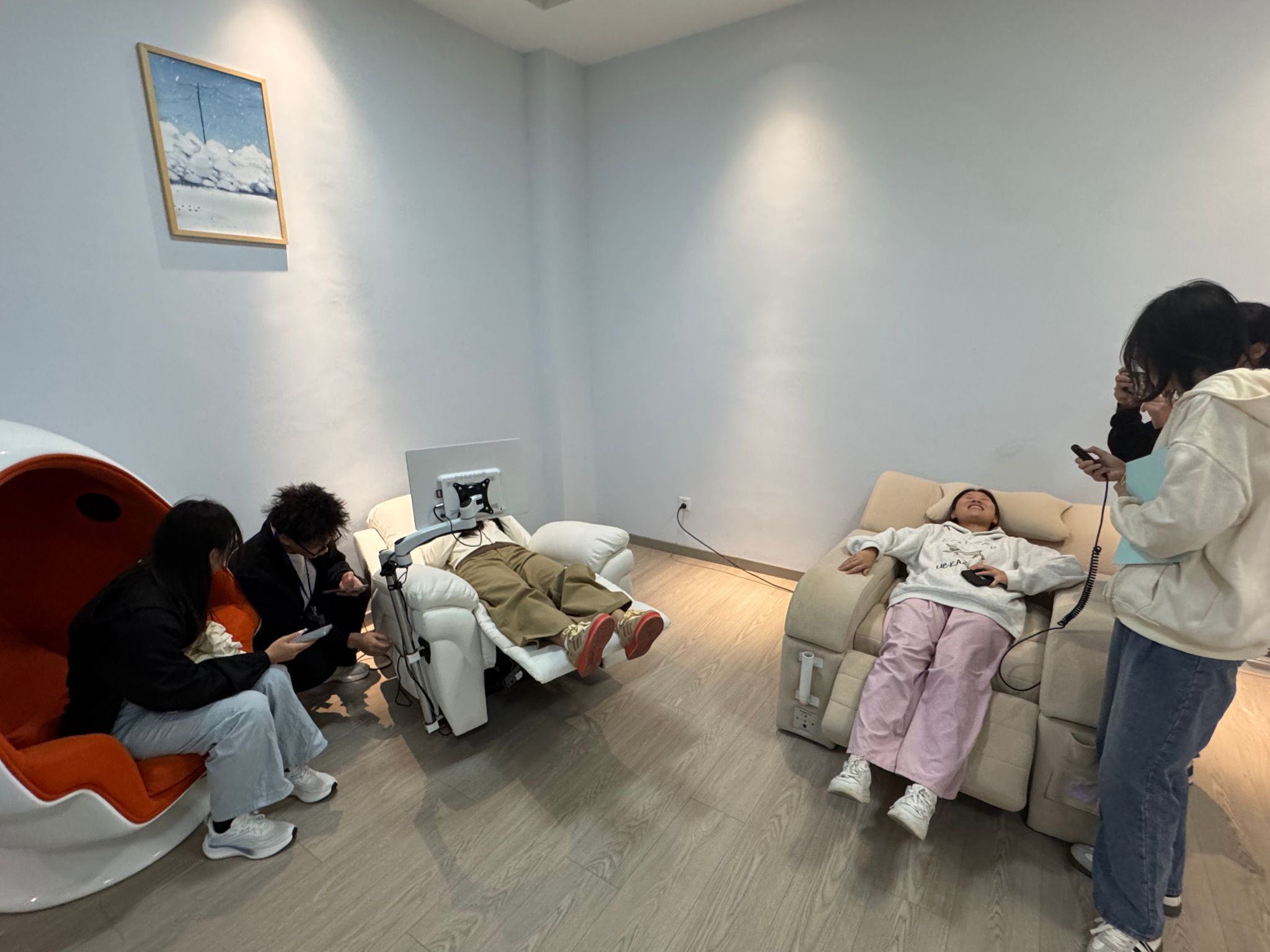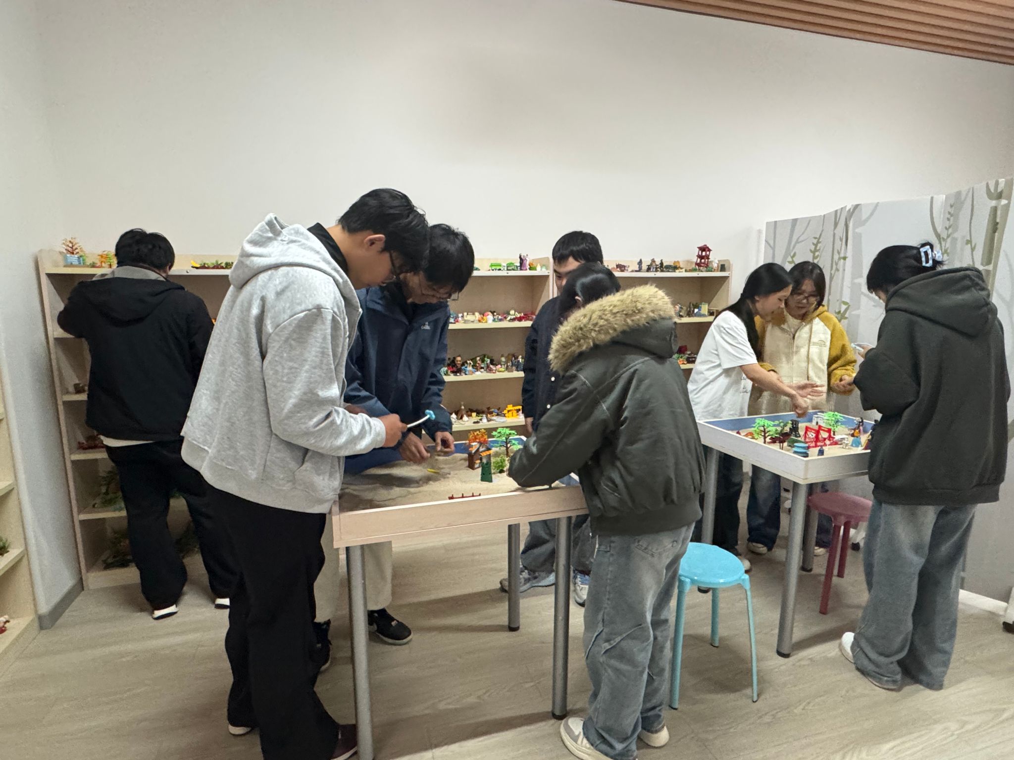 随后,在学生干部的引导下,同学们有序走进心理健康教育中心,逐一参观并沉浸式体验了团体辅导室、情绪宣泄室、音乐放松室、沙盘咨询室等八个专业功能区。其中,情绪宣泄室、沙盘咨询室与音乐放松室凭借强互动性,成为现场最受欢迎的 “打卡点”。大家在宣泄室以安全可控的方式释放压力,在沙盘室用沙具自由搭建场景、无声倾诉内心思绪,在音乐放松室伴着舒缓旋律,于专业放松椅上沉淀身心、感受宁静。这种零距离的沉浸式体验,将抽象的心理咨询服务转化为可触可感的真实场景,既让同学们直观了解了心理服务的形式,更有效消除了对心理求助的陌生感与顾虑。