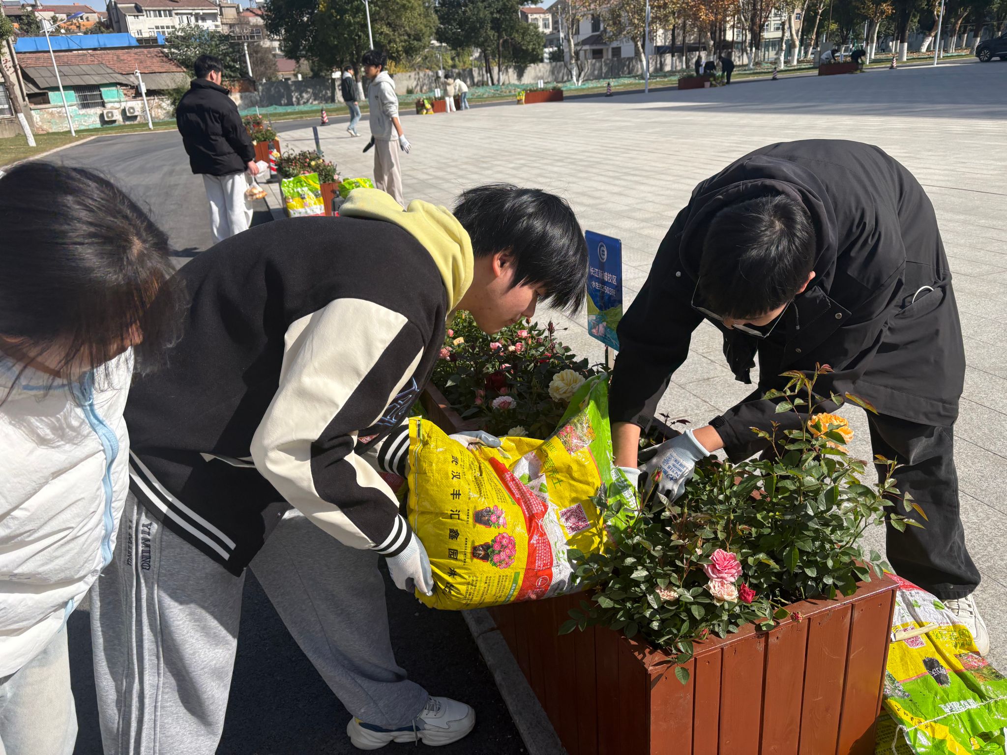 种植活动当天,所有同学在种植老师的带领下,现场学习如何装土、拆盆、培土等。随后,学校统一发放月季、手套、营养土等种苗与种植物资,同学们亲手将种苗栽入种植箱内,动作虽略显生疏却充满热情——有的仔细铺平营养土,有的小心翼翼扶正花苗,广场上顿时洋溢着青春的活力与对生命的期待。