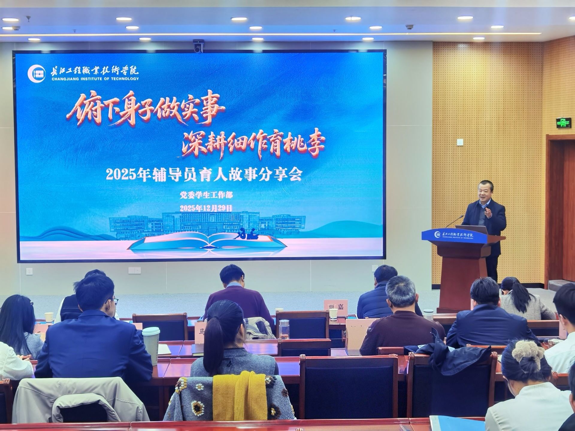12月29日,我校2025年辅导员育人故事分享会决赛在校园隆重举行。学校党委书记马大奎、党委委员、副校长卢俊出席活动并为获奖选手颁奖,党委宣传部、学生工作部、保卫部、校团委主要负责人、各二级学院党总支书记、副书记及全体辅导员到场观摩。本次活动邀请武汉工程大学、武汉船舶职业技术学院、武汉交通职业学院相关领导专家与校内职能部门负责人组成评委团,12名从二级学院选拔中脱颖而出的辅导员同台竞技,分享育人路上的温暖与坚守。