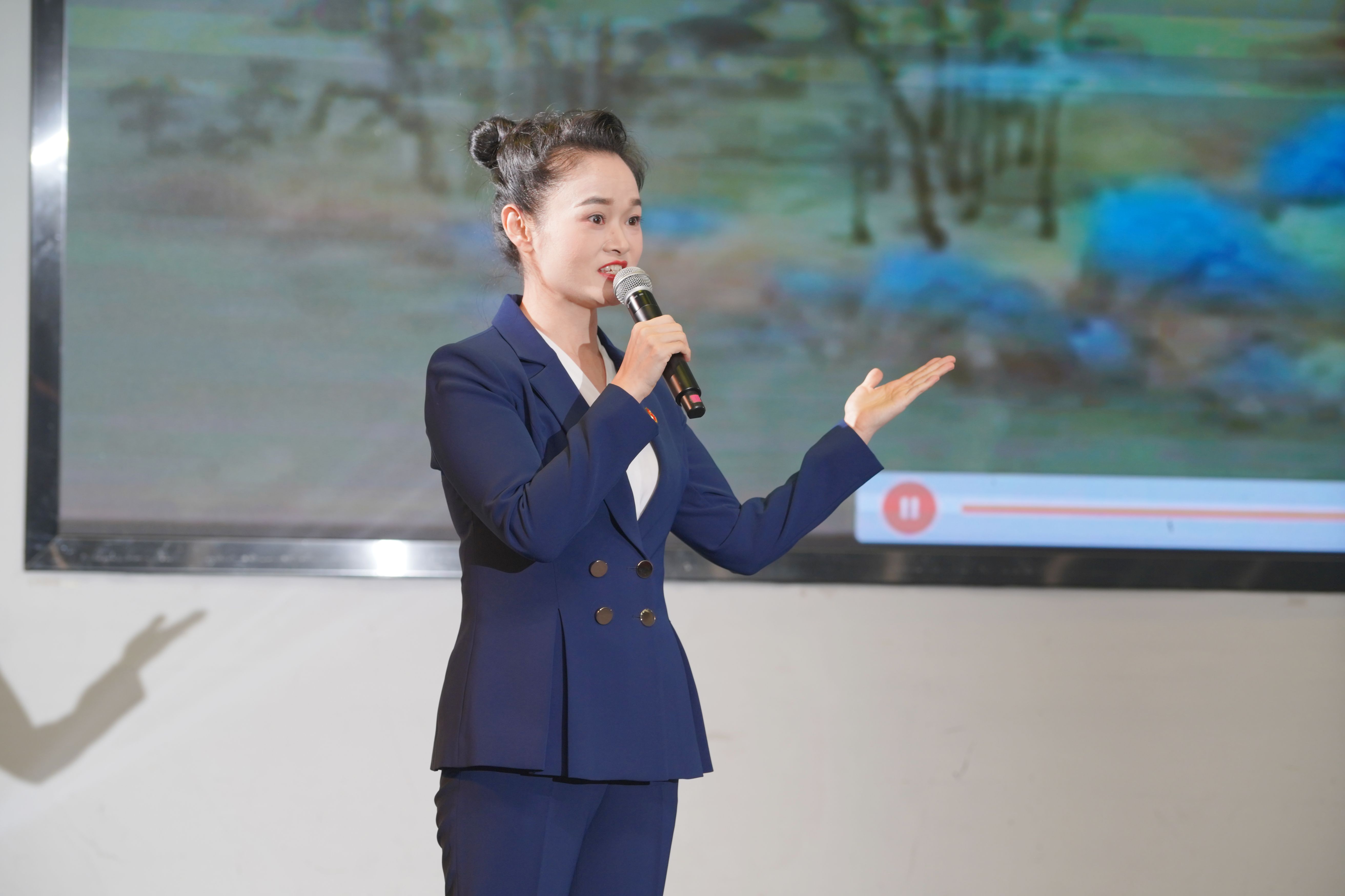 本期课程以《千里江山图》为文化内核,采用数字人点睛+双师联袂授课+学生实践展示+互动创作的模式,构建完整育人链条。课堂上,数字人“王希孟”以“形异而神同,器新而道续”寄语串联古今;美育教师雷茹解析画作艺术美学,思政教师周明结合希孟青春担当与学校办学特色升华主题,实现从物质分析到精神对话的跨越。