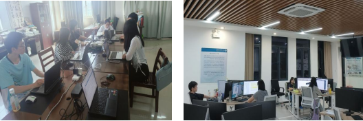 ▲丁若彤带领组员完成实训(右二)▲丁若彤随老师实地走访(左七)