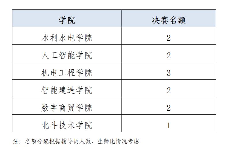 请各学院按名额(如下表)推荐选手参与校级决赛。学校将依据校级决赛结果分别设立一、二、三等奖。